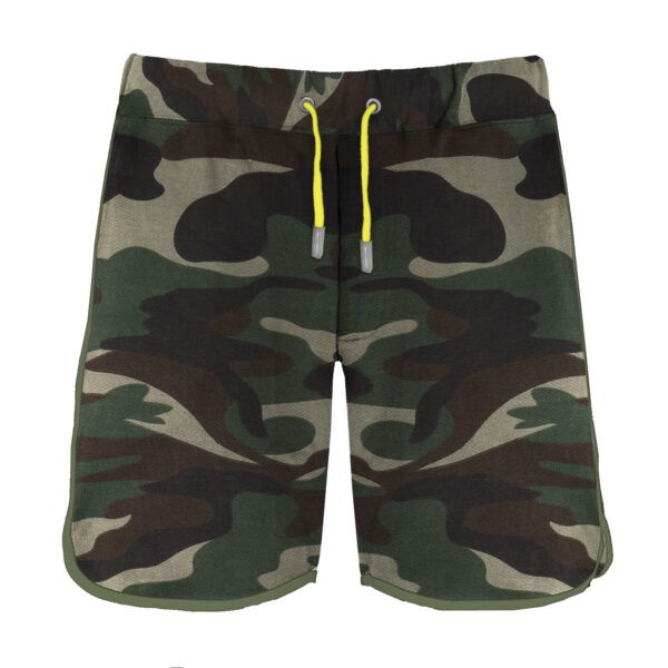 Bermuda enfant en sweat avec élastique et cordon coulissé à la taille, zip avec patte, deux poches sur le devant et liseré de finition en contraste.