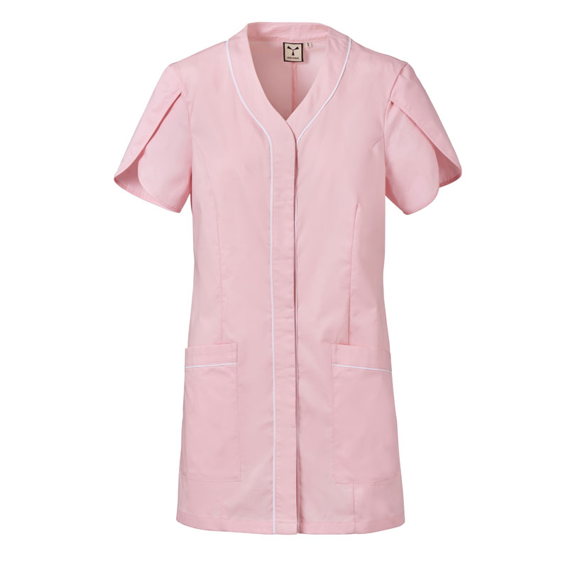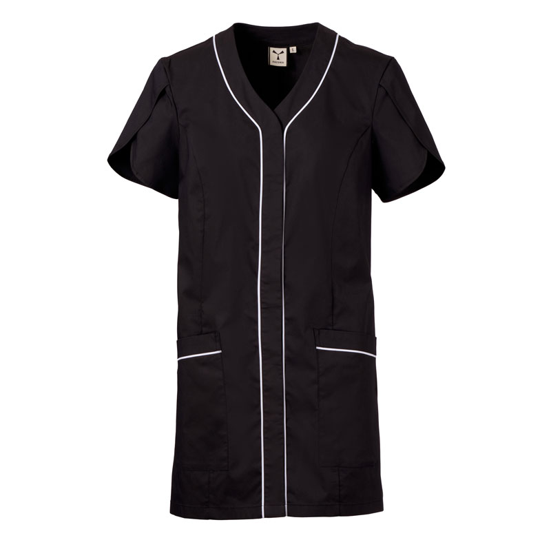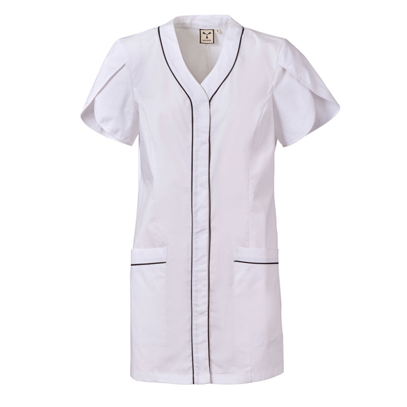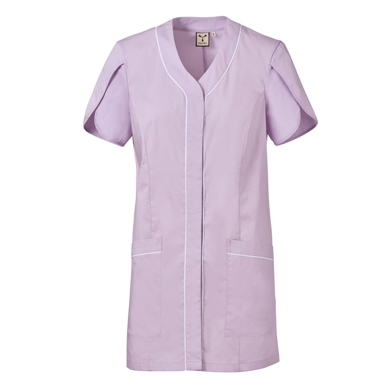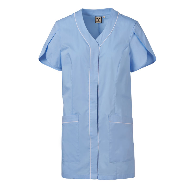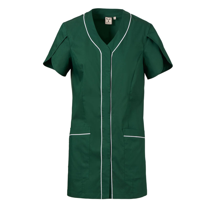Blouse femme à manches courtes forme tulipe, avec col en V, réalisée en popeline de coton, polyester et Lycra® T400®, associée à un tissu mesh confortable sur les côtés, pour assurer une respirabilité et une liberté de mouvement maximales.