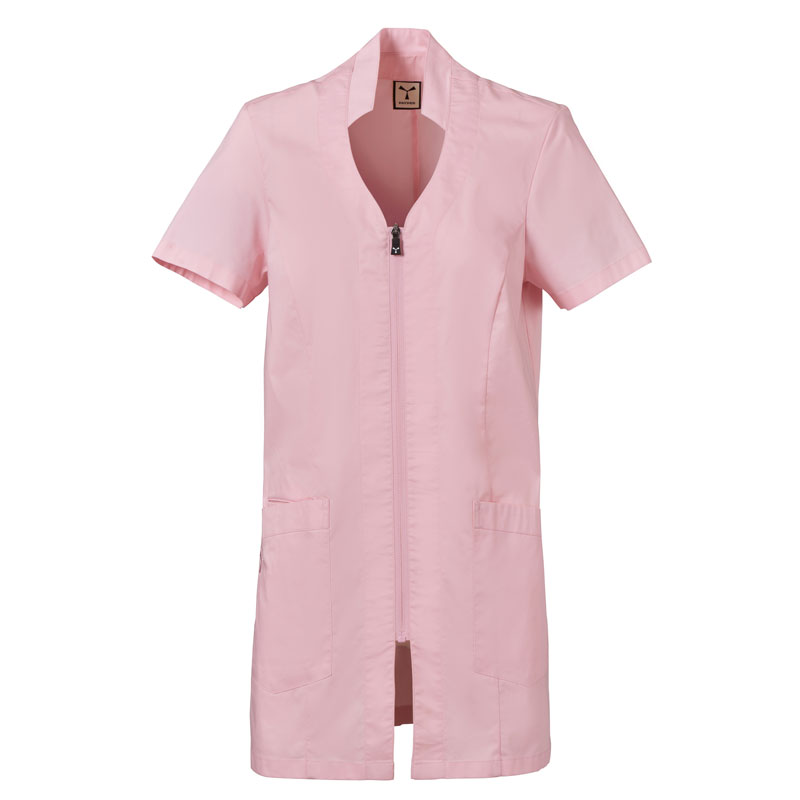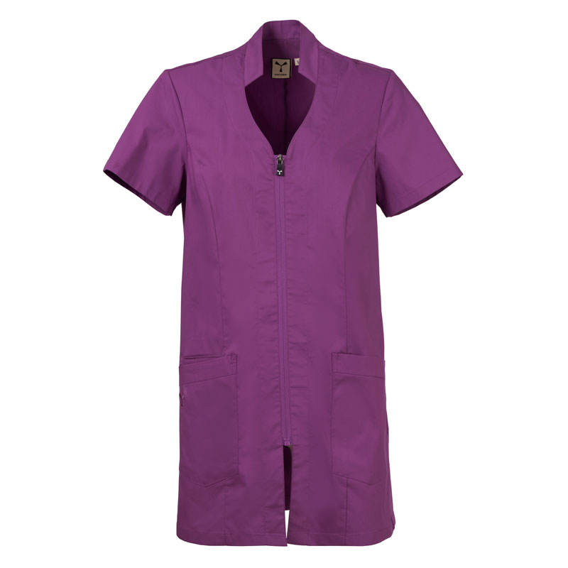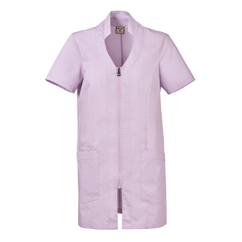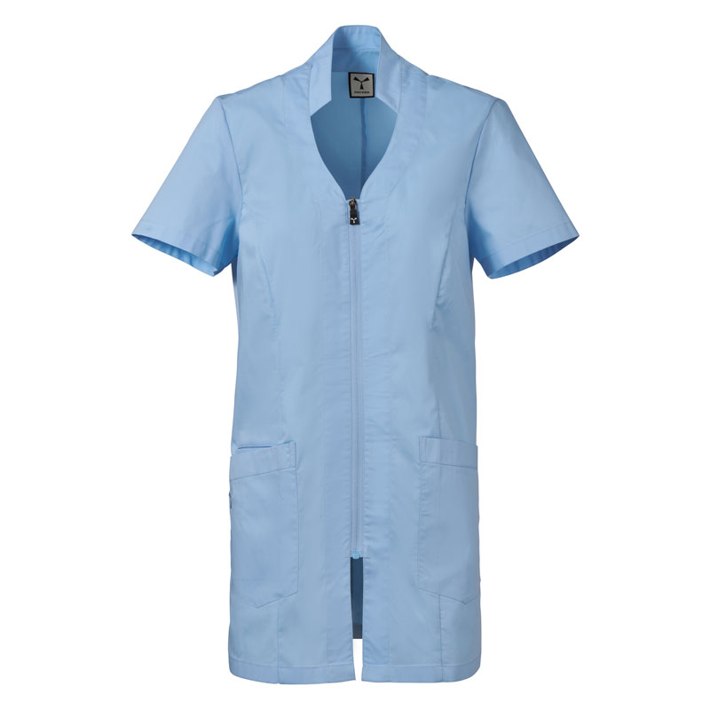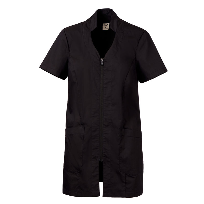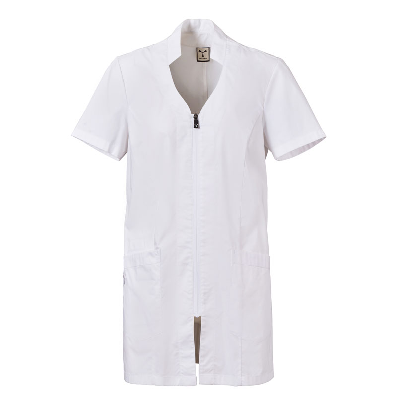 Blouse femme à manches courtes, avec col mao et un soupçon de forme en V, réalisée en popeline de coton, polyester et Lycra® T400®, associée à un tissu mesh confortable sur les côtés, pour assurer une respirabilité et une liberté de mouvement maximales.