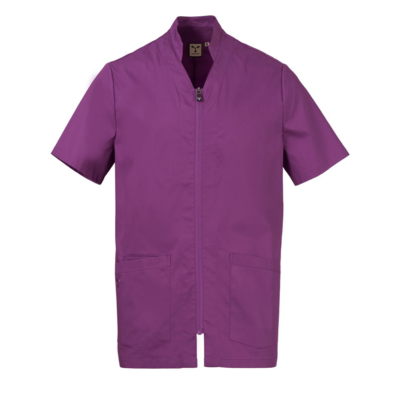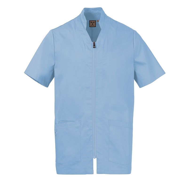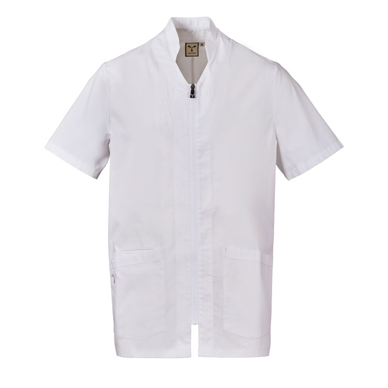 Blouse homme à manches courtes, avec col mao et un soupçon de forme en V, réalisée en popeline de coton, polyester et Lycra® T400®, associée à un tissu mesh confortable sur les côtés, pour assurer une respirabilité et une liberté de mouvement maximales.