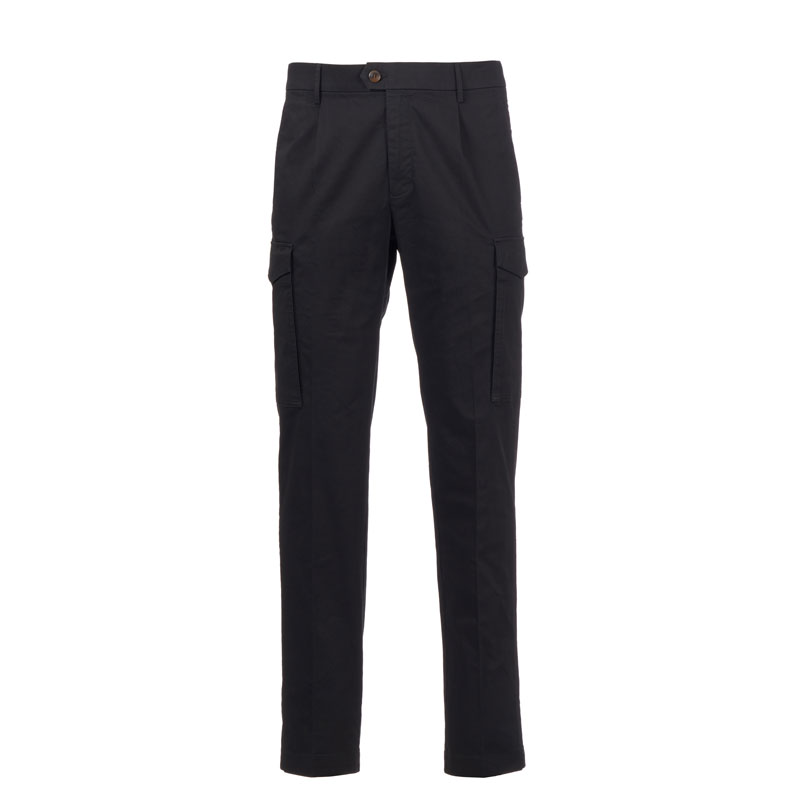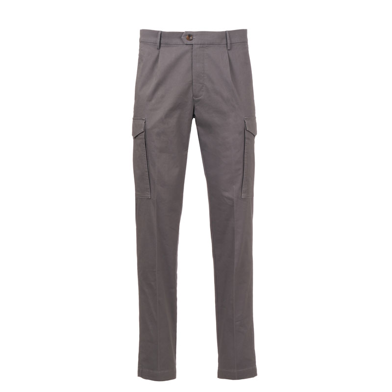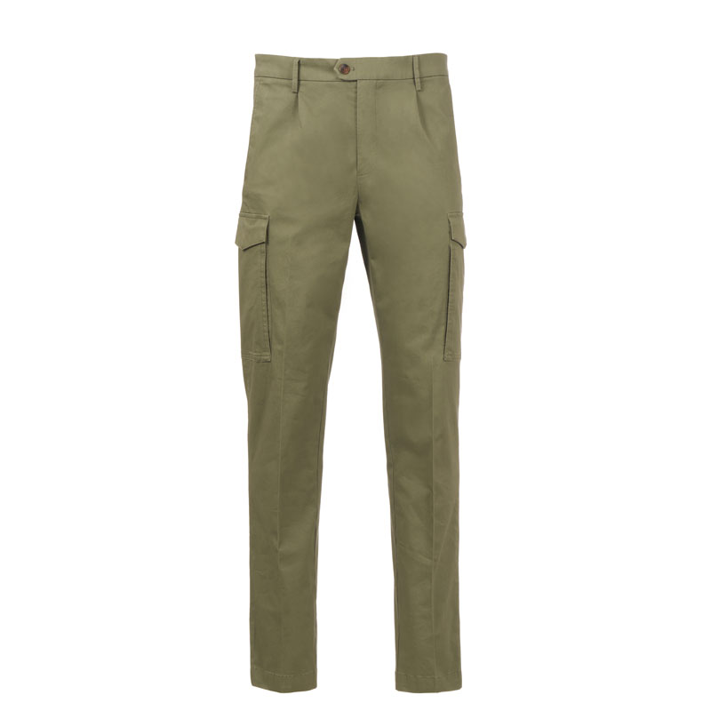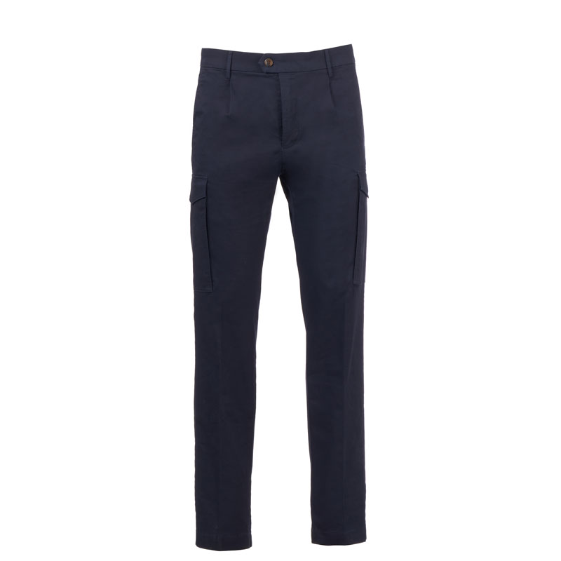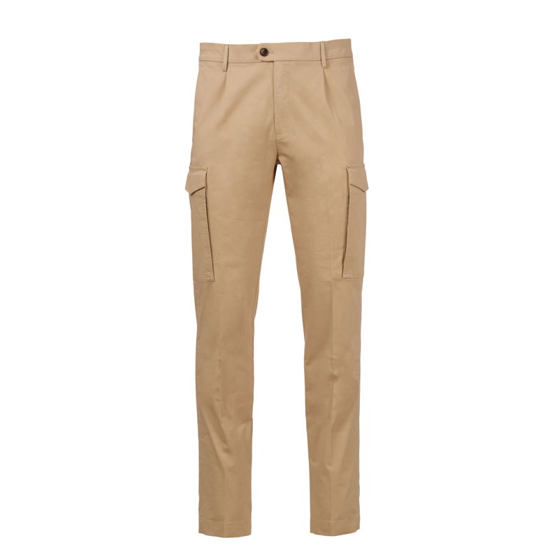 Pantalon chino, d’été, en gabardine stretch, coupe contemporaine, avec passants de style sartorial, fermeture par zip et patte de boutonnage décalée avec 2 boutons.