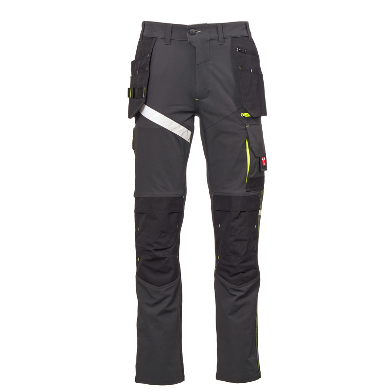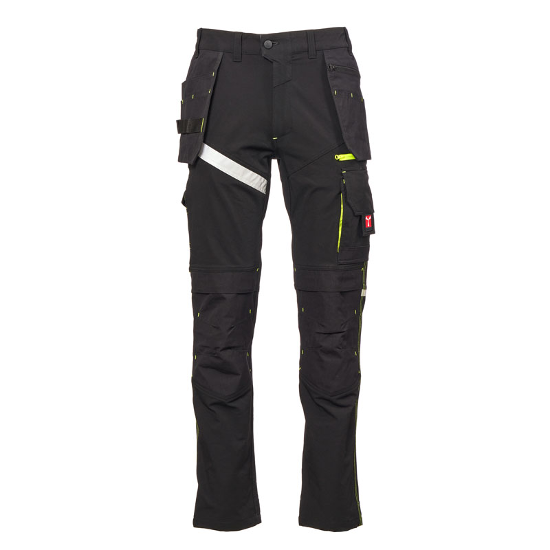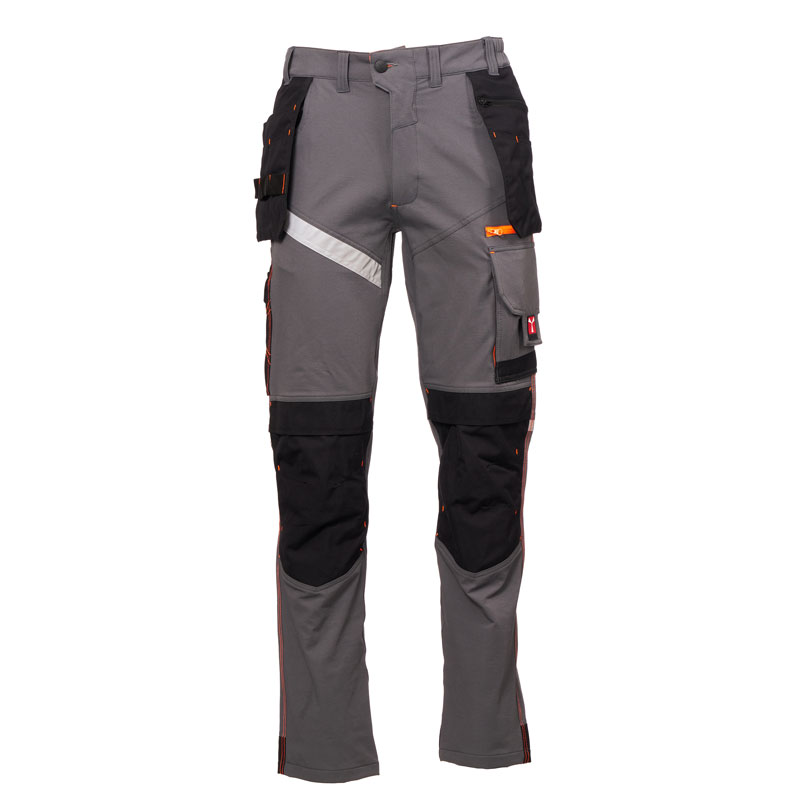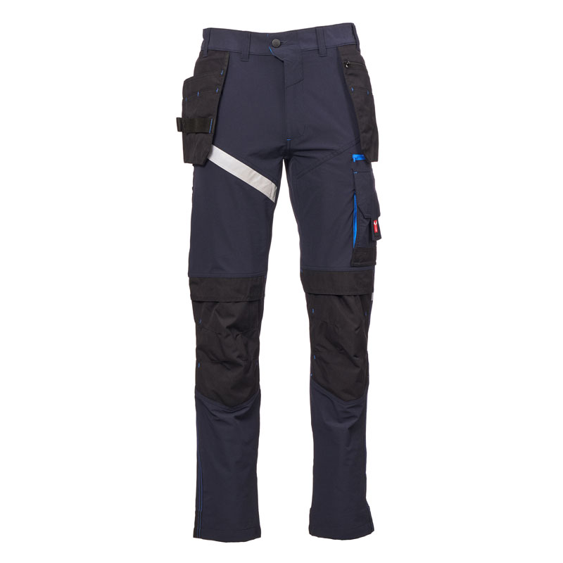 L’arrière comporte : une poche à rabat avec fermeture autoagrippante, un anneau porte-marteau, une poche ouverte porte-mètre et une poche pour smartphone avec rabat et fermeture autoagrippante (jambe droite) ; une poche ouverte avec deux bandes rétroréfléchissantes (jambe gauche) ; des inserts rétroréfléchissants au niveau des genoux et une talonnette en tissu en contraste pour les deux jambes.