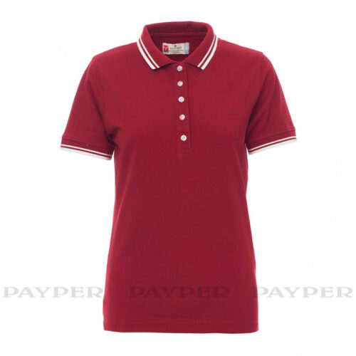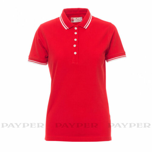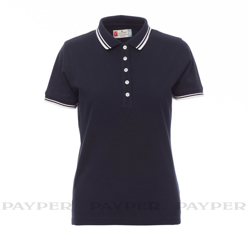 Polo cintré pour femme à manches courtes et 5 boutons blancs, col et bordure des manches en bord côtes avec fin profil en contraste, fentes latérales avec couture de renfort, coutures du col couvertes, ruban de renfort latéral, coutures stretch, renfort profilé sur encolure arrière.