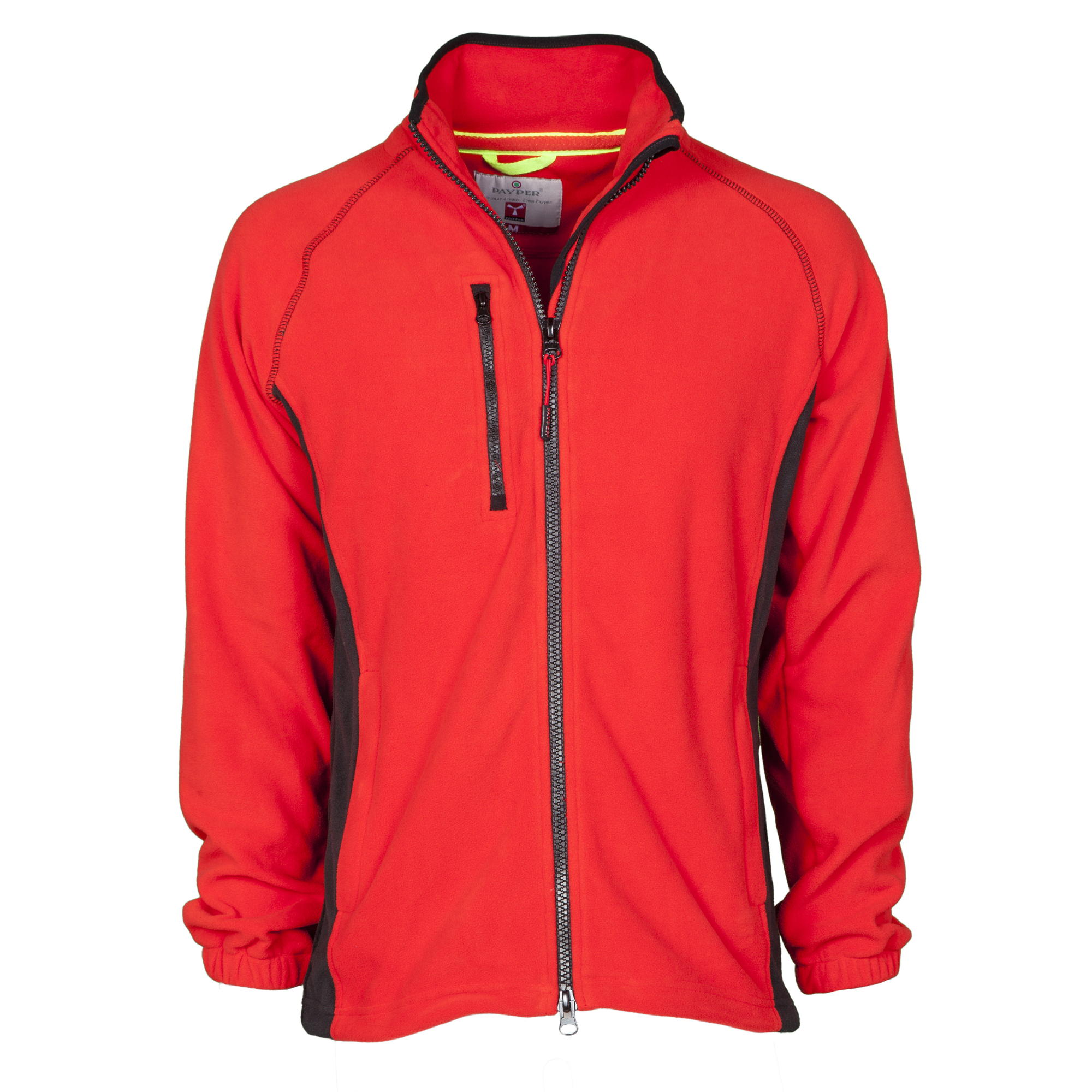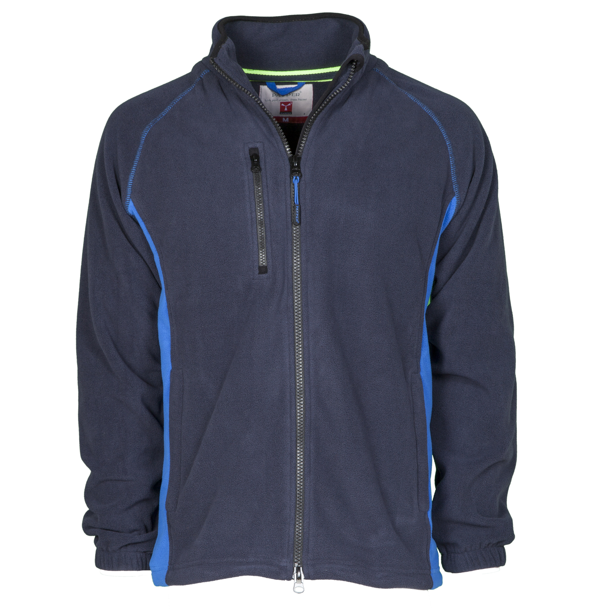Veste polaire bicolore pour homme à zip intégral de 8 mm en plastique noir, manches raglan, coulisse réglable à la taille, élastiques serre-poignet, deux poches avec zips couverts, une poche avec zip sur le devant, col avec bordure de renfort en contraste, coutures renforcées.