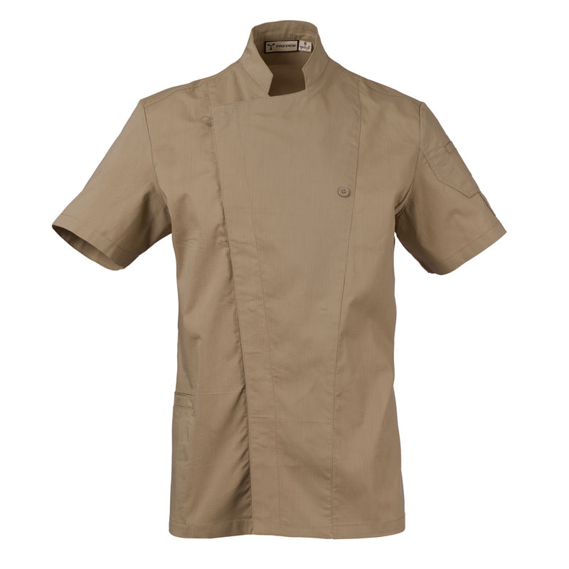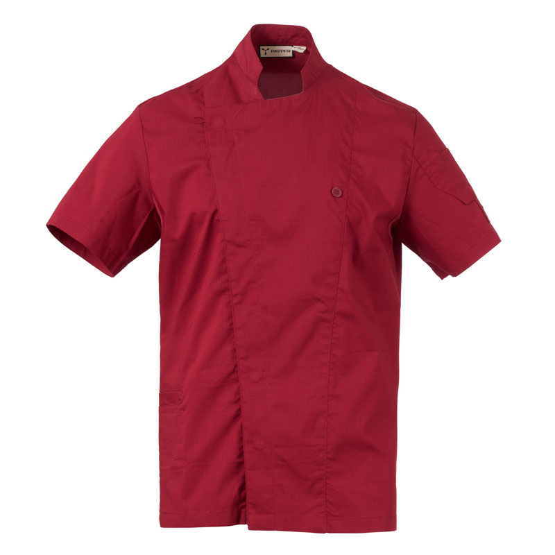 Veste de cuisine homme à col mao, réalisée en ripstop de coton et Lycra® T400®, avec d’excellentes propriétés élastiques et respirantes, et avec un tissu mesh confortable sur le dos et les emmanchures, pour amplifier la respirabilité.